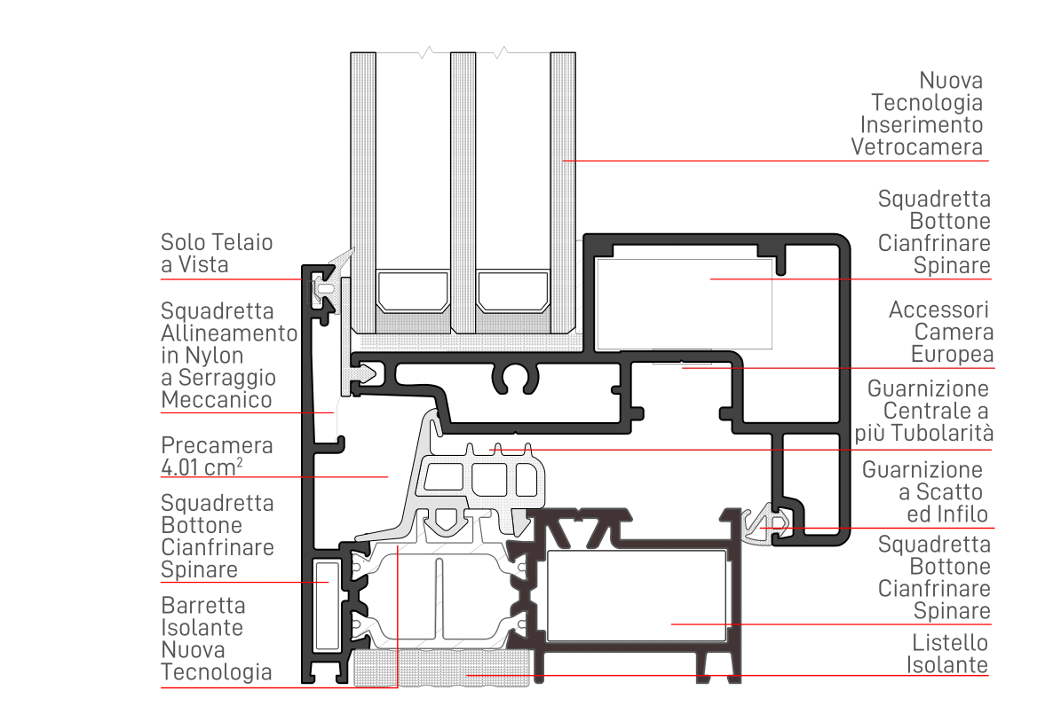 Profilati per finestre che consentono la costruzione di infissi ad una, due o più ante a battente, nella versione a giunto aperto con anta nascosta.