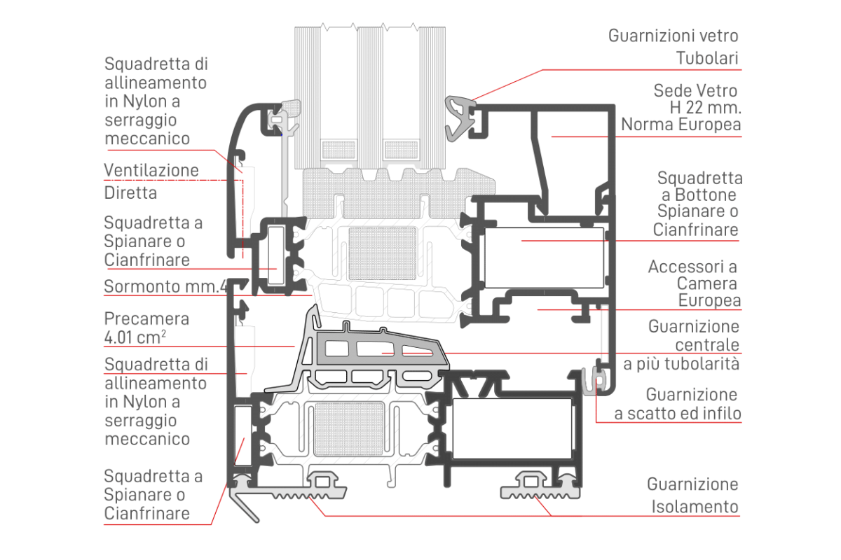 Profilati di grandi prestazioni per finestre che consentono la costruzione di infissi ad una, due o più ante a battente, nella versione a giunto aperto o con doppia guarnizione di battuta complanari all’esterno e a sormonto all’interno.