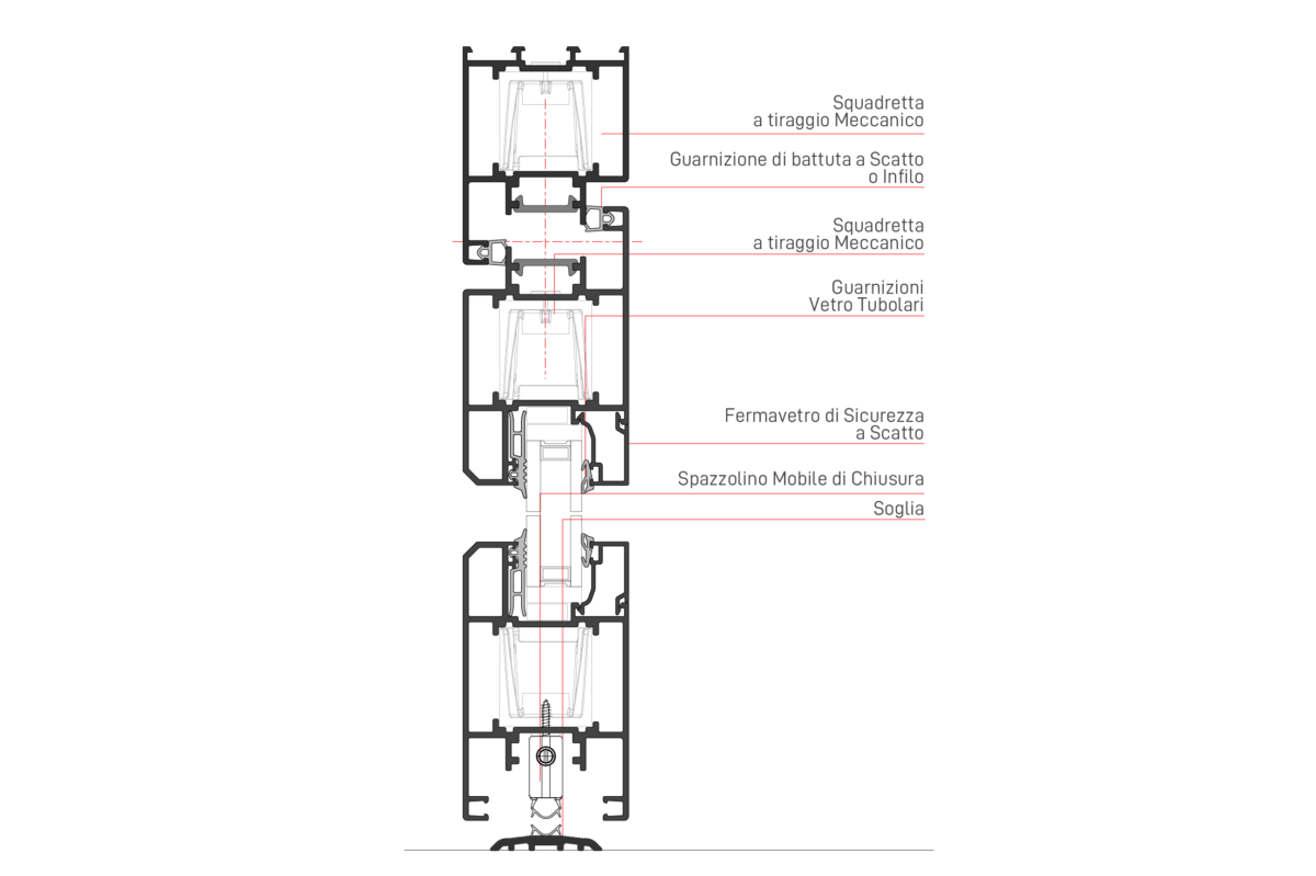 Altezza utile alloggiamento vetro: mm. 22 Inserimento volumi di vetro/pannelli con spessori variabili tra mm. 10 e 35