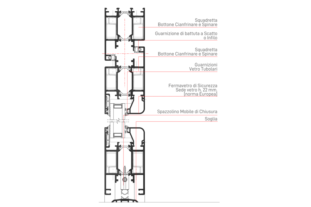 Altezza utile alloggiamento vetro: mm.22 Inserimento volumi di vetro/pannelli con spessori variabili tra mm. 10 e 50.